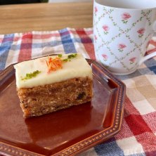 マットしわしわ🤣 お持ち帰りキャロットケーキ🥕 しっとりぬん。とした感じの生地。スパイスは弱め。ナッツ、レーズン、パイン?が入ってて噛む度にニンジンのシャリシャリ繊維を感じる。 生地もフロスティングもほんのり甘い程度のかなり素材系。この素朴さがキャロットケーキのよさ。 今日は午後休とって、再開発によるクローズ前にCATS🐱鑑賞へ✨ 自転車で行ける距離なのに意外と行かなかった😆