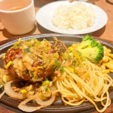 【和風ハンバーグ】 200gです。 スープとサラダがおかわり自由なので、 ハンバーグ来る前に結構満足しちゃう。 結果、お腹いっぱい。 男性客の方が多いのわかる😅