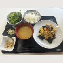 久しぶりの社食 鶏肉のハーブ焼きとスクランブルエッグをケチャップライスの上に乗せてオムライス風に 柿は嘱託のおじいちゃんが持ってきた柿をアレンジして出してくれた。 生ハムとクリームチーズで和えてあった。