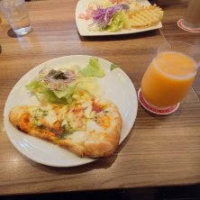 今日は朝から快晴☀️ 花粉が飛びまくる中、ちょっとブレイクタイム(ブレイクタイム…ふるっ😅) 北陸限定…加賀棒茶のリコッタパンケーキ🥞&加賀棒茶付き🍵 金粉も散らしてあるぅ✨ パンケーキはお茶の味が濃くてフワフワ(✿︎´ ꒳ ` )♡︎ 喋り過ぎてアイスコーヒー追加…(*≧︎∀︎≦︎)∩︎〃ウヒャヒャ!!!!!