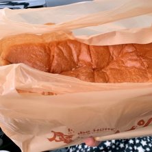 にぎわいの森にある 魔法のパン屋さんの 食パン ちょうど焼きたてまで あと少しだったので並んで買ってみたー(*´˘`*)♡焼きたてでホカホカ 家まで待てずコンビニでコーヒー買って家族でパクパク。