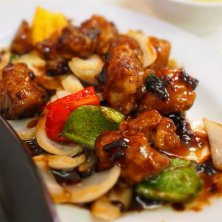 黒酢豚定食。黒酢特有の臭いも抑えられ味に深みがあります。これだけで結構ご飯がすすみます。