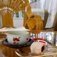 温泉上がりに、竹庭を眺めながら お茶と和菓子でホッとひといき🍵