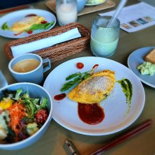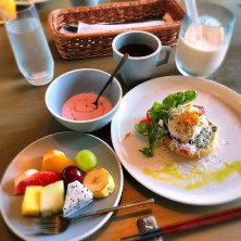 沖縄・読谷村でホテル朝食。 メインは四種のセットメニューから選ぶそうで、 大好きなエッグベネディクトにしました。 チョップドサラダがあったのが嬉しい😄 あまりホテルでは見かけませんよね。 こちらは大人限定のホテルだそうで、 なかなかのかっこよさ。 ライトアップされたプールが素敵でした。