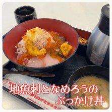 <地魚刺となめろうのぶっかけ丼> 地魚のお刺身となめろうを堪能しました。 終盤にだし汁をぶっかけたら美味しさが倍増しました。 (金谷食堂/富津市)