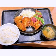 すかいらーくグループの唐揚げのチェーン店、から好しの梅しそおろし唐揚げ合い盛り定食の6個入り。 ニンニクと生姜不使用の特製ダレに漬けた定番のモモ肉の唐揚げが3個と梅おろしと紫蘇を乗せた唐揚げが3個にキャベツを添えたメインに、御飯と味噌汁がセットになった定食。 2種類の唐揚げが食べられるからこれにした。しかし、唐揚げは大きいのはええ物の、食べづらいし味自体も何だか微妙やった。同じチェーン店の唐揚げ定食を食べるならば自分としてはからやまの方が好き。