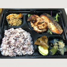 焼魚弁当 発酵食品を使った料理を提供するお店のお弁当を買いました。今日のメインは鮭の塩麹マスタード焼き。茄子の煮浸し1つとっても美味しかったです。右下の、キャベツとピーマンの間みたいな野菜が何者かわかんなかった。