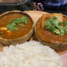 魚介カレーと野菜カレーの2種盛り🍛🦪🦐 今回の魚介は牡蠣と海老とアサリ、野菜は大根とひよこ豆とほうれん草でした✋ 大ぶりの牡蠣は食感ふっくら、野菜カレーの大根はおでんのような大きさながらスプーンで切れる程しっかり煮込まれてました✨