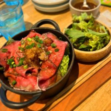 ご飯の上にたっぷりのお野菜、焼肉と特製タレ、そして最後に卵をトッピング。よーく混ぜて、いただきまーす!