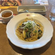 お昼はジョリーパスタのサービスランチ、ナスとアサリの和風パスタですあって