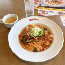 お昼はジョリパでランチ メニューは魚介とベーコンのトマトソース ~アンチョビ風味~をチョイスしました。