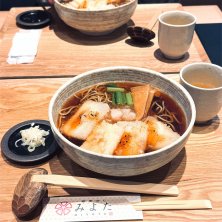 蕎麦きり みよたで『揚げもちみぞれ』 新潟の黄金餅を揚げて大根おろしと一緒に 温かいお蕎麦の上に乗ってますʕ•ᴥ•ʔ お餅が柔らかくて美味しい😋
