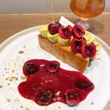 こちらのお店とは相性が良いみたい(*'‐'*) ウフフフ♪︎ 日曜日のお昼過ぎに行ったらイートインの席が空いていて待たずに座れた 前回も前の2人組の方は待ち時間30〜40分と言われていたのに次の私は1席だけ空いているとかですぐに座れたし 🍒アメリカンチェリーとピスタチオのミルフィーユ (eat in only) サックサクのパイにサンドされているのはムースリーヌとガナッシュ 上に乗ったピスタチオクリームは濃厚 アメチェはコンポートもあって2種類味わえた 文句なしの美味しさ❤︎