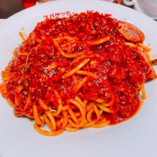 ◆ミートソース(メガ) ¥890 ※並、大、メガお値段同じ ◆ぶっかけミート ¥300 ※税込 隣りのお客さん、見た感じ50歳くらいのオジさんで、ナポリタンをラーメンをすするようにズルズルズル〜〜と大きな音を立ててケチャップソースを撒き散らしながら食べるわ、卓上置きの粉チーズを一口ごとに超超超大量にかけてほぼ満杯だった粉チーズの壺が空っぽになるわでもう環境最悪、大好物ミートソーススパゲッティを心地よくいただく事ができずガッカリでした。 いい歳して公衆マナーがなってない大人ってサイテーですね!