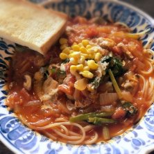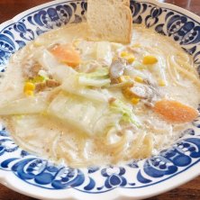器久しぶり〜! 少し前は2枚看板で、ランチは違うお店の看板が出てたと思うんだけど、器の看板しかないから元に戻ったのかな? 白菜とツナのスープスパ。 サラダとコーヒーが付きます♪