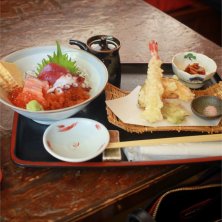 日替りランチ ・知床地鶏葱そば (金平牛蒡, アスパラ, 白髪葱, のり, トマト) ・さんま蒲焼き丼 ・(紅生姜, 水菜, さんしょう) ・南京サラダ