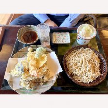蕎麦セット せいろ蕎麦と十割蕎麦に、天ぷらと蕎麦ゼリーが付きます。薬味は山葵ではなく、辛味大根のようなものが出てきました。 立派な農家の建物をリノベーションした店舗で、落ち着いた雰囲気の蕎麦屋でした。