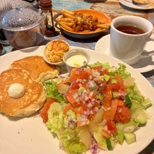 パンケーキとサーモンサラダのプレート🥞🥗 ボリュームがすごい😂お腹いっぱいだ〜