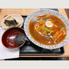 カレーうどんと海老天むすび(^-^) 揚げが入っているのは関東に住んでる人は珍しい👀 揚げが美味しいからあり😋 本日2個目の海老天むすび(笑)