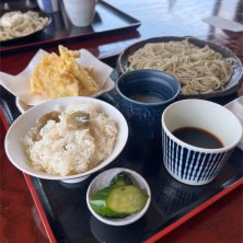 今日のお昼に食べた、山かけそばと大山鶏の鶏天! 左下の器に大山で採れた自然薯が入ってます。 ここの鶏天は絶品!大山鶏がふっくら柔らかく美味しい。 ^ ^