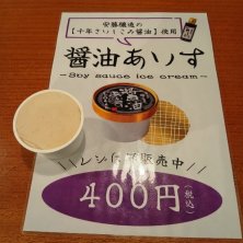 麹とかの醸造店で醤油アイス。 他にも無料で味噌汁や漬物の味見できた。