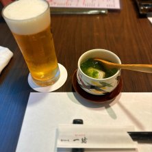 お通しとビール ヒラスズキのあおさ餡掛け