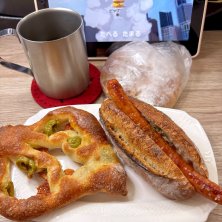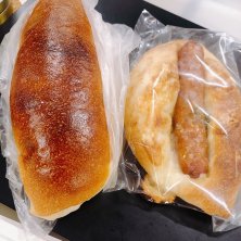 しもまち散策続きー! みなと街ベーカリーさん。 人気なので、昼過ぎには売り切れちゃうこともあるので、早い時間に行けて良かった。 初の食パン、米粉使ってないと思うんだけど、もちもちでめちゃ好きだわ! チーズパンは間違いない美味しさ♪