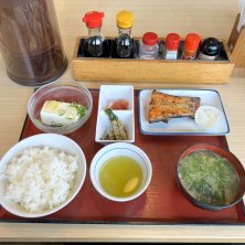 お昼はフジオフーズの今宿食堂でいただきました。塩シャケが塩辛かった😓