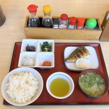 お昼はフジオフーズの今宿食堂 サバの塩焼きが美味しかった。