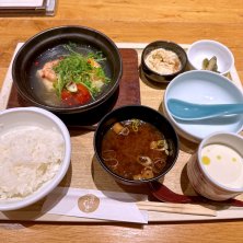 つむぎのこだわりセット。 白ごはんを湯葉丼に変えてもらいました。 焼き物、揚げ物、刺身、おからのサラダ、揚げ出し豆腐、茶碗蒸し、味噌汁。