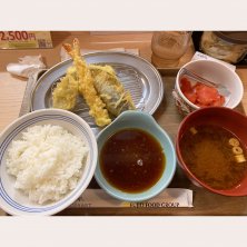 こんにちは! 今日も先輩と昼飯です😄 海老三本丼❣️ イカ、白身魚、温玉、野菜も2つ付いてました♬ 美味しかったです😋