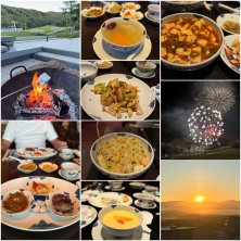 北海道ごはん♡ 夕方になるとエントランスで焚き火タイム。 いつも部屋から見てるだけだったけど、食事前に寄ってみた。そういえばマシュマロ焼けるんだった。 でも焼きマシュマロは甘過ぎて苦手… 旦那は大好きなので自分で焼いては食べ、私にもおいしいからと食べさせ大満足な様子。笑 夜は中華♡ ここの中華は本格的で美味しい。 コースで。前菜(北寄貝と筍の辛味和え・クラゲ・焼豚)、鶏スープ、帆立とアスパラのXO醬炒め、麻婆豆腐、海鮮炒飯、マンゴースープ 紹興酒2本空けて外で花火鑑賞と今朝の日の出♡