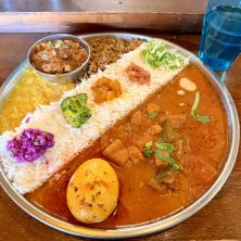 カレー紀行 夏の舞 其の二 メニューはワンプレート一種! う、美しい!! インスタ(DM)から事前に 食数の確保🆗! この日の盛り付け~~ ぶどうミソ、マンゴーチャトニ ナス炒め、ポルサンボル、桃チキン フェンネルキーマ、春菊 人参グリーンピース w/スパイス味玉