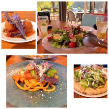 ROTONDOロメインレタスの彩りサラダ 北杜市明野特選米のライスコロッケ 玉葱クラシックアマトリチャーナブカティーニ 高原野菜のサラダ モッツァレラパンチェッタピッツア 八ヶ岳高原野菜がたっぷり (๑⃙⃘♥‿♥๑)♪✧✨♫•*¨*•.¸¸♪✧ 店内には大きなピザ窯も! 外の風景を眺めながらの早めのディナー🍽️でした