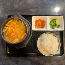 【今日のランチ】 「韓国料理居酒屋・土房(トバン)市ヶ谷店@九段南四丁目」で「日替り:餃子スンドゥブ」700円。晴れたり曇ったり。微妙に暑い。しかも湿度が高い。そんな今週もココからスタート。最近は「餃子スンドゥブ」か「チーズスンドゥブ」が週始めの定番。続く火曜日は「厚切りサムギョプサル」と言うコトになるケースが多い。個人的に「餃子スンドゥブ」は久し振り。「韓国風餃子=マンドゥ」から出る「出汁」が良い仕事をしてくれる。「豆腐」は近所の老舗豆腐店の物だ。実直な仕事が「美味さ」の秘訣。ごちそうさま。