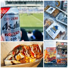 ラグビー観戦🏉の日のランチ 焼きそば 唐揚げ タコスサンド 今回は出張できてる会社の米人さんたちもアテンドで📣応援。 日本のスタジアムの席は彼らには小さすぎてきっつきつ🥹🥹