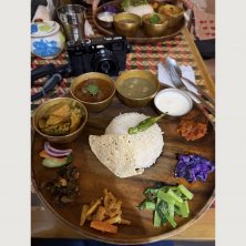 Shivaratriスペシャル 芽キャベツとじゃがいものカレー 骨付き山羊肉カレー ダル ギー 苺ラッシー パクチーとバン(麻の実の)アチャール ライオコサーグ(高菜)ムラコアチャール ミョウガのアチャール スージ ダルモト(豆のスナック)