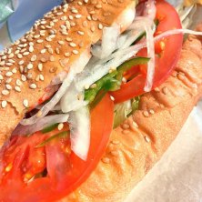 ローストビーフを長いパンで。野菜類は全部乗せで。