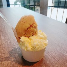 古町10番町の居酒屋、喜ぐちさんが古町通を挟んで向かいオープンさせたパイ&ジェラートのお店です。 仕事終わってから行くと閉まってたりして、今まで行けてませんでした。 今日も4時過ぎに行ったら、すでにパイは完売。 ジェラートをイートイン です。 伊予柑、チョコレート、キャラメルナッツのトリプル。 コクがあるのに甘すぎず、あっさりペロリでした♪ これはまた来ねば。 次こそパイも!