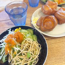こんにちは! 【買い物デー】 今日は朝イチで横浜南部市場でお買い物。 お買い物の前に朝ご飯。 ・モーニングプレート 妻も同じものを食べました。 お野菜たっぷりのワンプレート。 生野菜やお豆がいっぱい食べれて大満足。 オプションで ポップオーバー(右奥)やスープ(左奥)が食べ放題。 ポップオーバーは、 シュークリームの皮のような感じのパン。 そのまま食べても美味しいし メープルシロップを付けても美味しい。 スープも具沢山でとっても美味しかった。