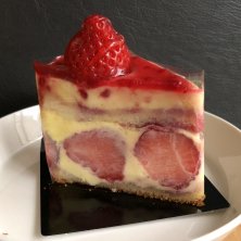 ・気まぐれケーキ こちらも事前に予約しておいたフレジエ ふわふわのジェノワーズに軽めのムースリーヌ、フランボワーズソース、大粒のいちごがゴロゴロ入って嬉しい! トップはムースリーヌにフランボワーズソース。 フランボワーズの酸味がムースリーヌと好相性。 おいっしぃぃぃ!!