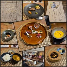 お口はじめ 信州サーモン燻製 山葡萄ジュレ仕立て 信州牛の柔らかコンフィ 醤油ムース添 香ばしく焼いた蕪 カラメル味噌仕立て 茅野産味噌チーズ 干し柿とオリーブ添 鹿味噌そぼろ 紫芋ムースとチコリ彩り 信州大岩魚 雪見がけ スープ 南瓜と豆乳の薬膳スープ 温菜 鰻のデミグラスシチュー おやきと猪肉のリゾットコロッケ 肉料理 信州牛ステーキ 季節の野菜 ご飯もの 蓼科スープカレー デザート 八ヶ岳牛乳を使用した嶺岡豆腐 2026/01/04 夕食