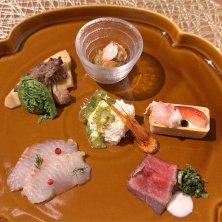 お口はじめ 真鯛 伊那産甘のマリネ 桜葉包み 八ヶ岳赤卵の海老真薯入り卵焼き 鴨ロースト 北山産ブルーベリーソース 安曇野産のわさびチーズタルト スモーク信州サーモンと新じゃがのタルタル ハマグリのジュレ