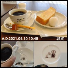 カップを持ち上げると、おっちゃんが現れた! こういった遊び心に弱い花隈です(*´ω`*) 敦賀駅から港の方に歩みを進めると、大きな商業施設が見えてきます。 その1階フードコート内に、ユトリ珈琲が入っておりました。 我が地元では馴染みの無い、石川や福井を中心としたチェーン店。 これは行かねばならんやろ、とモーニングをキメてきました☆ シンプル、実にシンプルなトーストのモーニング。 少し濃いめの珈琲が胃に沁みる。 ゆで卵の存在も実に嬉しい~♪ そして、一番ウケたのがカップの下。 ユトリ最高!