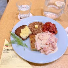 世界の朝ごはんカフェでリトアニア🇱🇹の朝食♡ すりおろしたジャガイモをオーブンで焼き上げたポテトパイ「クゲリス」に、ベーコンとサワークリームのソース、自家製のヘンプシードバターを塗ったライ麦パン、そばの実のカーシャ(お粥)、ビーツとニシン、ピント豆のサラダを合わせたワンプレート❣