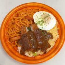 ついふらふらと手が伸びてしまった 広告の品 長崎名物 トルコライス 580円→551円税抜 688kcal タンパク質 20.9g 炭水化物 102.3g 太麺ナポリタン にはベーコンのみ カツ ピラフ カレーソース 目玉焼き風加工玉子 旨旨!