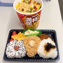 トップバリュー 3種のおにぎりとおかず 298円税抜 424kcal タンパク質 9.8g 炭水化物 74.9g 明星 一杯満足醤油味 118→106円 260kcal タンパク質 7.1g 炭水化物 37.4g 昨日と同じようなお昼 旨旨!