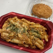パワープライス ペンネボロネーゼ 278円税抜 285kcal P11.8g F9.2g C39.9g Na2.9g 牛肉入りコロッケ 100円 192kcal P3.7g F10.4g C20.2g Na0.4g コロッケで足りない感カバー 旨旨!