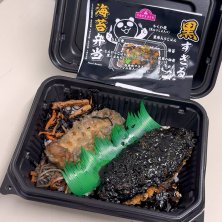 トップバリュー ブラックフライデー企画 黒すぎる海苔弁当 398円税抜 445kcal タンパク質 11.7g 炭水化物 62.9g 白身魚フライ に イカ墨入りソース 真っ黒だぁ 旨旨!