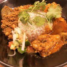 散歩で見つけたカフェに凸! 普段はワンプレートランチの様なんですが、5月はスパイスカレー月間らしく。 レッドチキンとダルカレーの合いがけ。 おー!なかなかいいお味。 サラダ、ドリンク付き。 また来たいですな😁